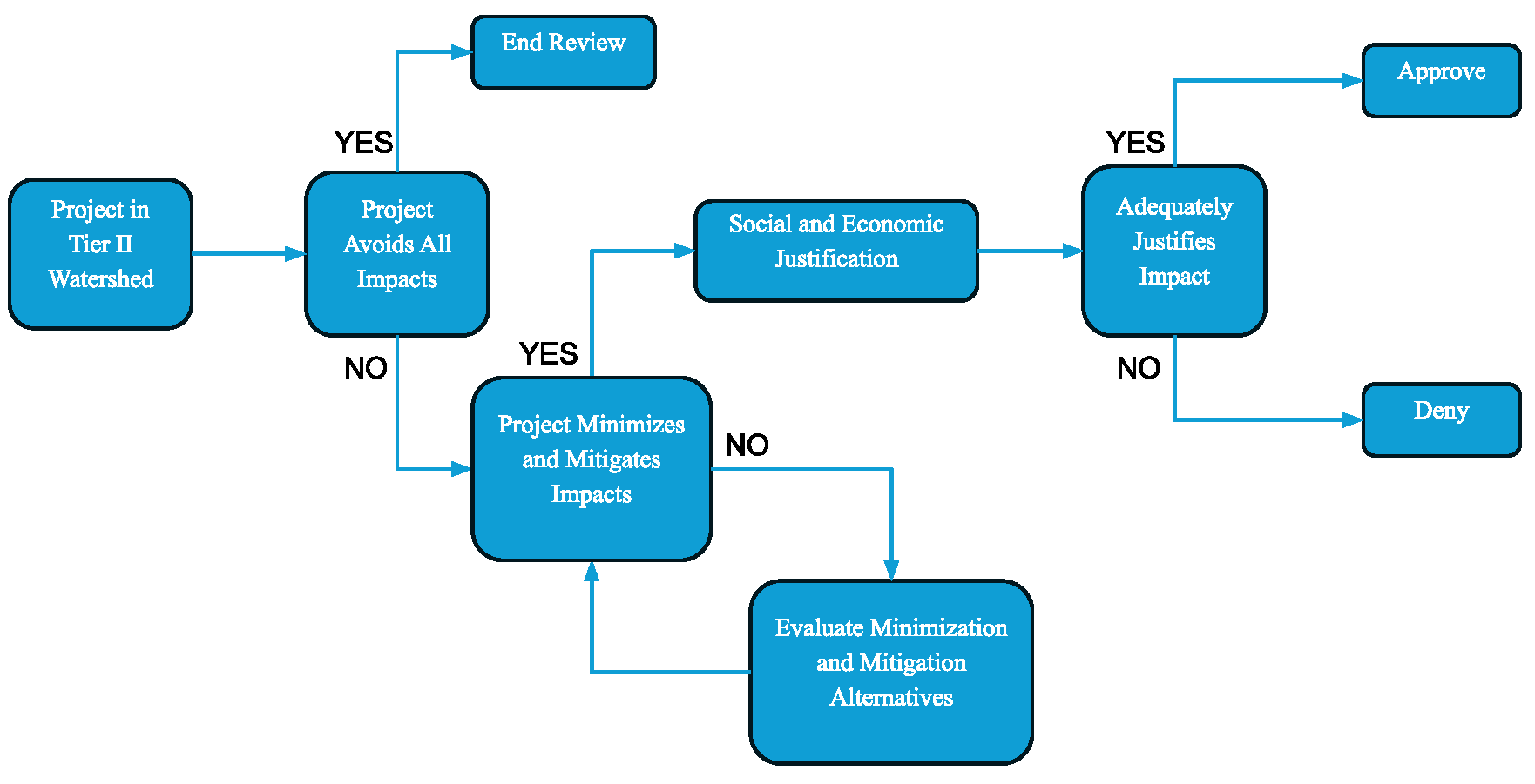 The Tier II review is implemented on a watershed basis using an upstream approach intended to protect downstream water quality. This means that regulated activities occurring anywhere within a Tier II watershed area may require a Tier II review. Using a science-based implementation strategy, the review identifies common impacts associated with a given regulated activity, and provides where appropriate, comments to help address those impacts. Permits and approvals may include special conditions and requirements to address antidegradation issues.