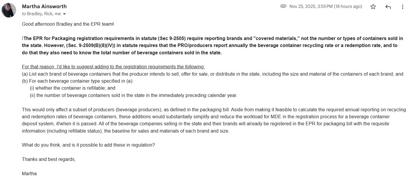 The study found that a well-designed EPR program could increase the state’s recycling rate from 34% to over 50%, generate $202 million in material value, reduce over 1 million metric tons of carbon emissions, and create more than 2,000 jobs — all without major impacts on the state budget. Since State agencies are required to recycle, MDE expects the cost of collecting that recycling to significantly reduce, saving taxpayers money.