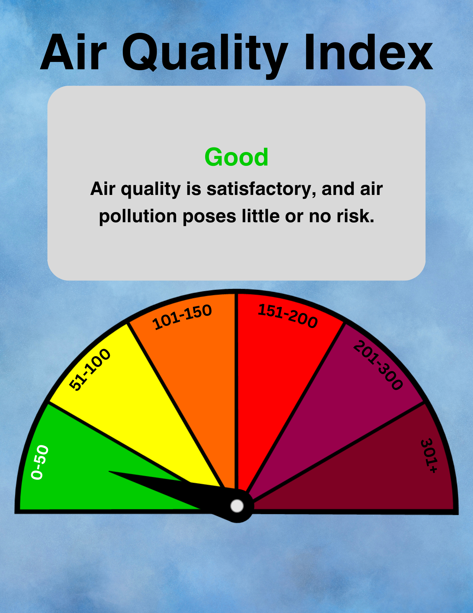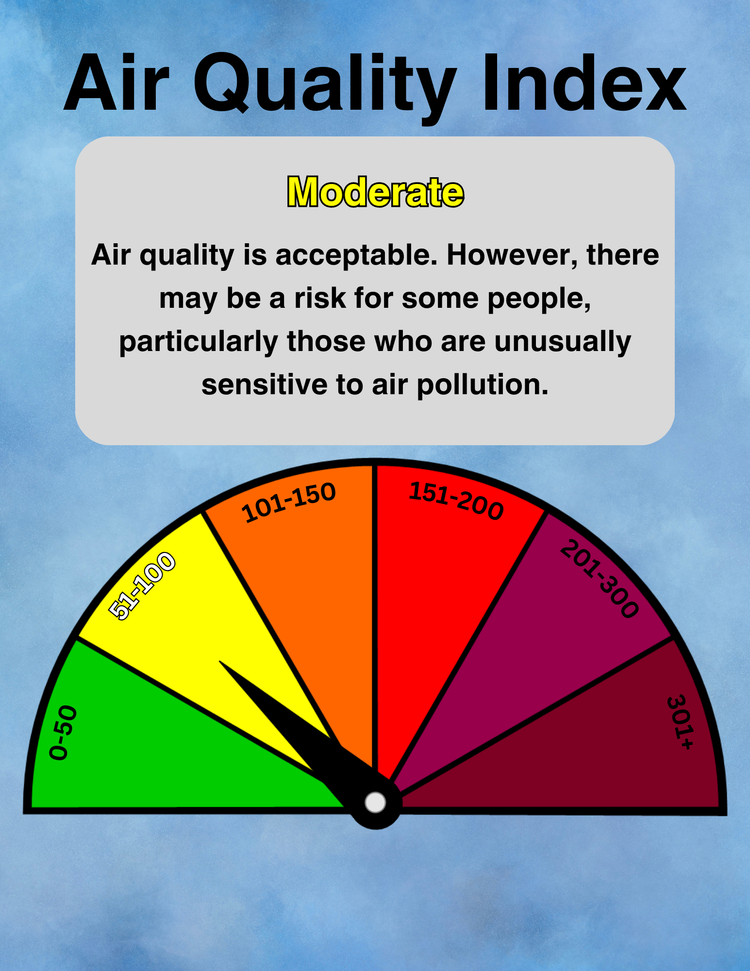 The Air Quality Forecast and current conditions are presented using the Air Quality Index, which is a color-coded scale ranging from